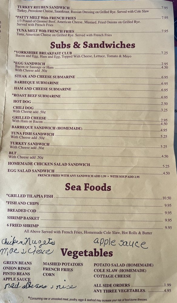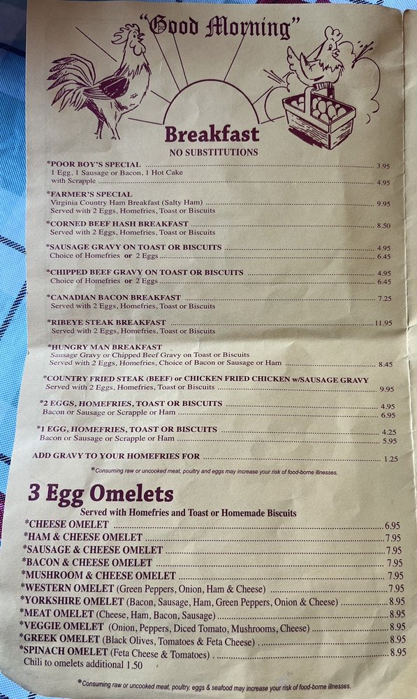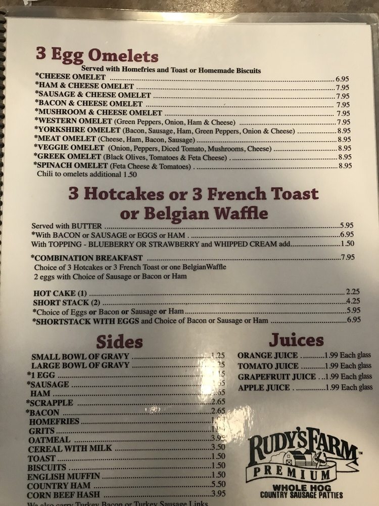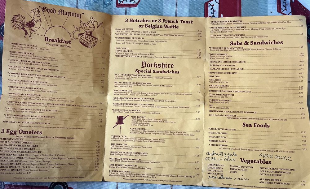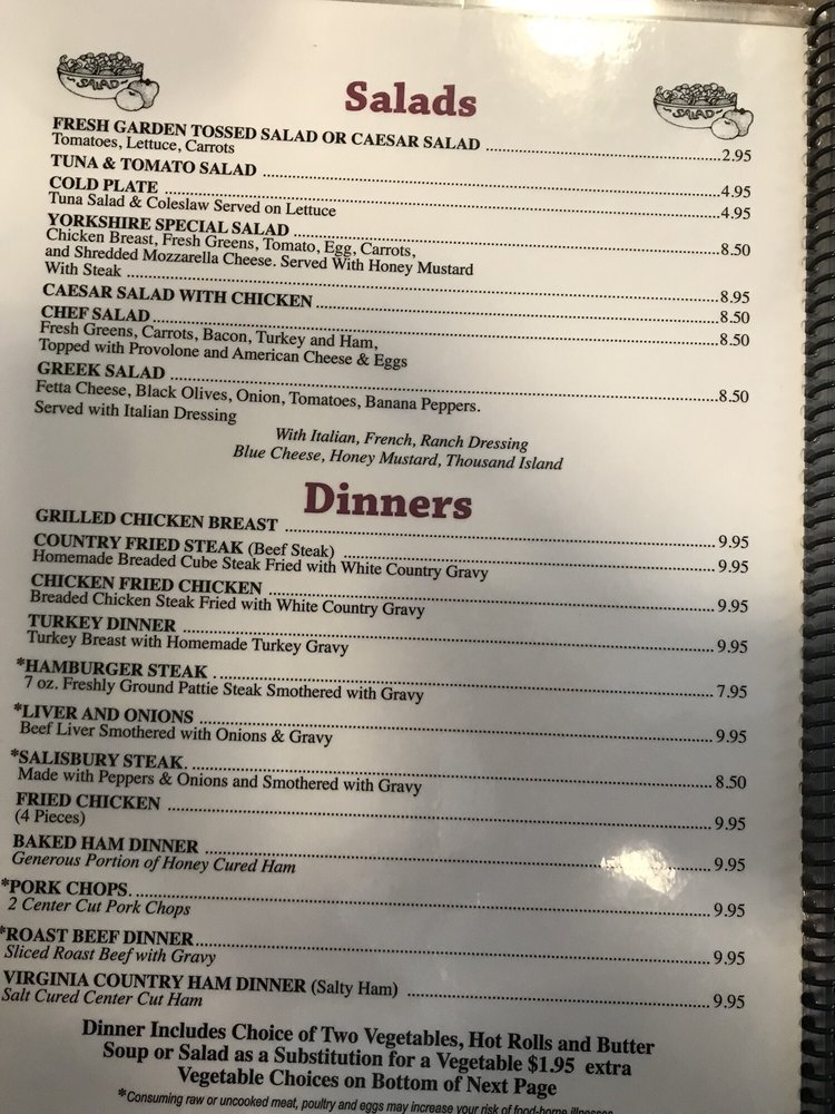 Yorkshire Restaurant, located in Manassas, VA, is a casual dining spot that caters to diners seeking classic seafood and breakfast options. Offering a variety of omelets, including bacon & cheese, Greek, and veggie options, Yorkshire Restaurant provides a satisfying dining experience for all tastes. The menu also features delicious breakfast items like chicken fried chicken, country fried steak, and the popular Farmers Special. With amenities such as private parking, Wi-Fi, and catering services, Yorkshire Restaurant is a great choice for group gatherings or family outings. The welcoming atmosphere and diverse menu options make it a must-try destination for those looking for a hearty and flavorful meal.